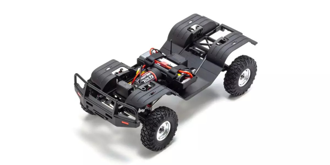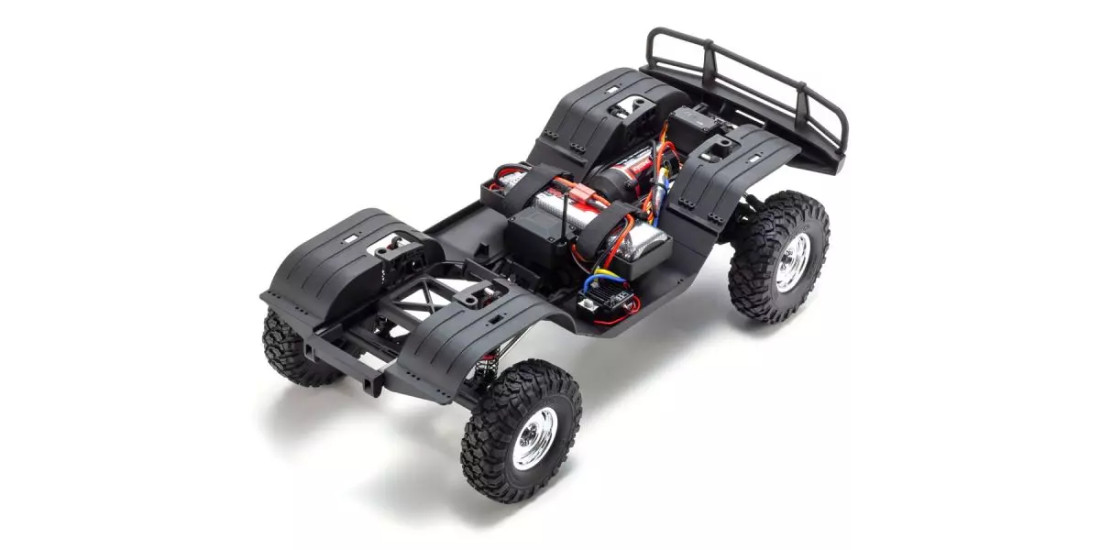 Die hohe Geländegängigkeit wird durch einen Gleichstrommotor der Serie 550 in Verbindung mit einem tiefsitzenden Getriebe mit Sinterstahlzahnrädern gewährleistet. Das Chassis ist mit großvolumigen Öldruckstoßdämpfern mit X-Ringen für minimale Reibung und sanftes Ansprechverhalten der Federung ausgestattet. Die Kraftübertragung erfolgt über Hypoid-Stahlzahnräder, die auch unter extremen Belastungen Zuverlässigkeit garantieren. Das Modell ist zudem für zukünftige Upgrades vorbereitet, beispielsweise mit einer On-the-Fly-Schaltung oder einer DIG-Funktion zur Hinterachssperre, die ein nahezu ruckfreies Drehen des Fahrzeugs ermöglicht. Wasserdichte Elektronik und ein Servo mit einem Schub von 15 kg/cm runden dieses Top-Expeditionsmodell ab.