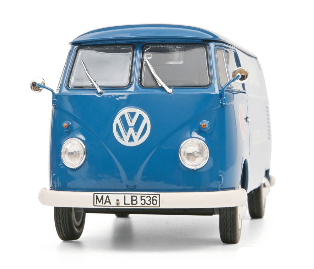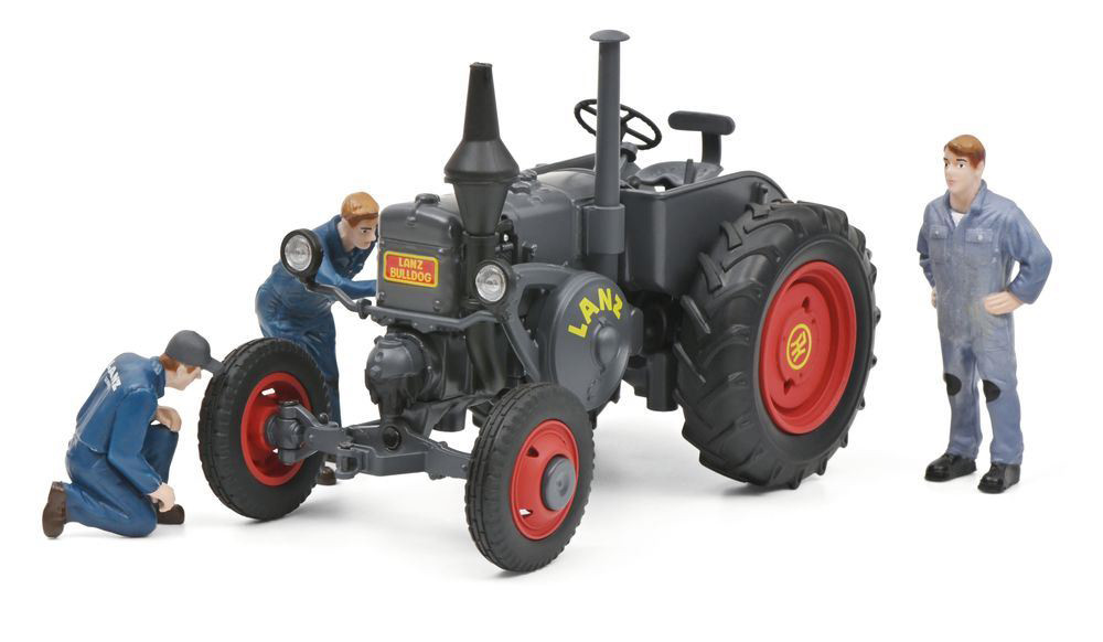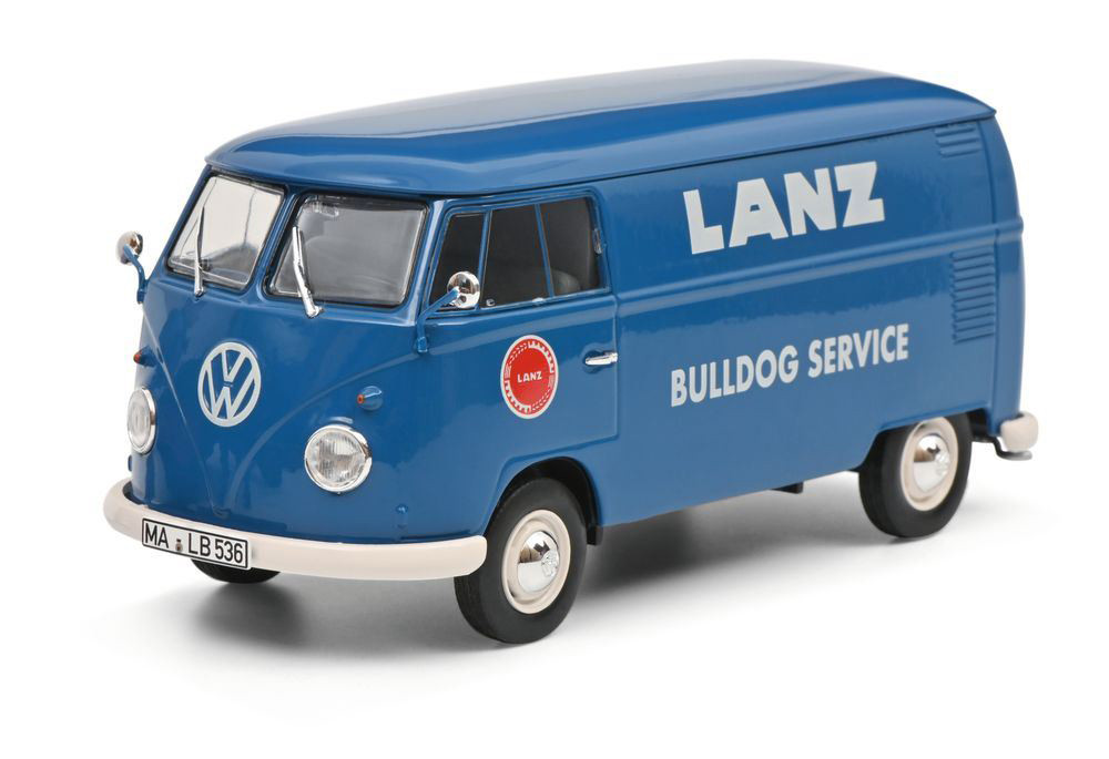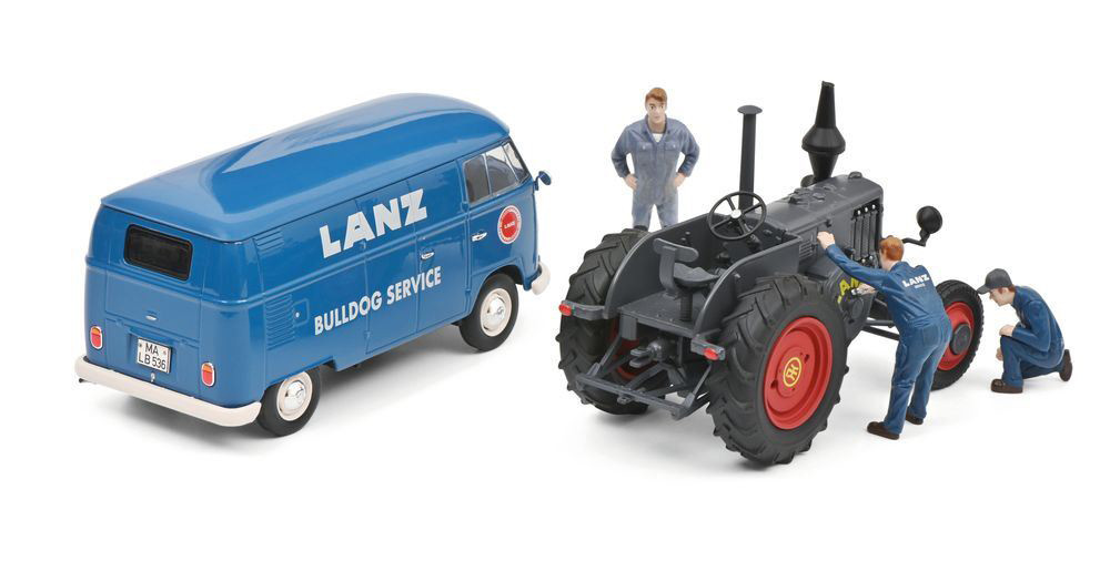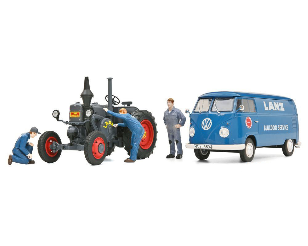 Kovový sběratelský model servisního vozidla Volkswagen T1b VAN, Lanz Asisstance od firmy Schuco je dodáván spolu se zemědělským traktorem Lanz Bulldog a třemi figurkami mechaniků.