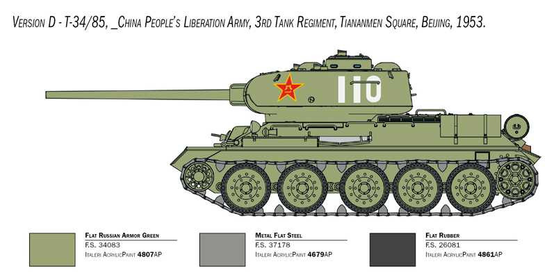 Jeho výzbrojí byl kanón D5-T, který byl používán v tancích IS-1, KV-85 a samohybných dělech SU-85. Vzhledem k problémům s dodávkami těchto kanónů byly od března 1944 montovány do tanků T-34 kanóny S-53 a od léta ZIS S-53 (L/53). Vedlejší výzbroj tanku tvořily dva kulomety DT ráže 7,62 mm, z toho jeden ve věži, druhý v čele korby. K pohonu sloužil vznětový motor V-2-34 o výkonu 500 HP. Podvozek sestával na každé straně z napínacího kola vpředu, hnacího vzadu a pěti velkých pojezdových kol, které byly uloženy na vlečených ramenech. Celkem bylo vyrobeno 22 883 kusů T-34/85.