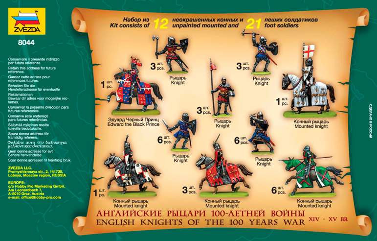Sada plastikových figurek zachycující anglické rytíře v období stoleté války v měřítku 1:72. Set obsahuje 33 nenabarvených figurek v různých autentických pozicích, a to včetně výzbroje a výstroje.