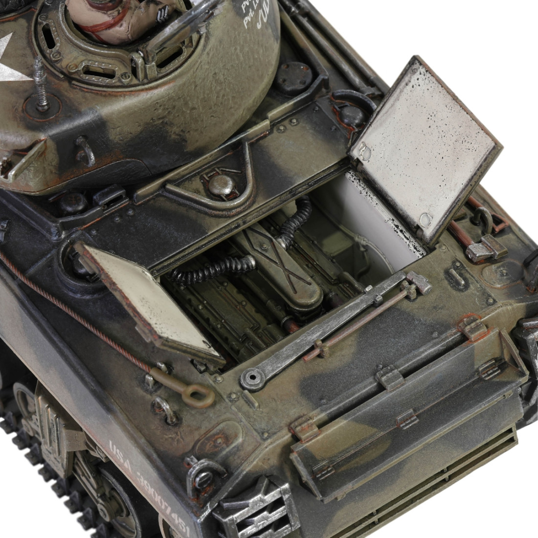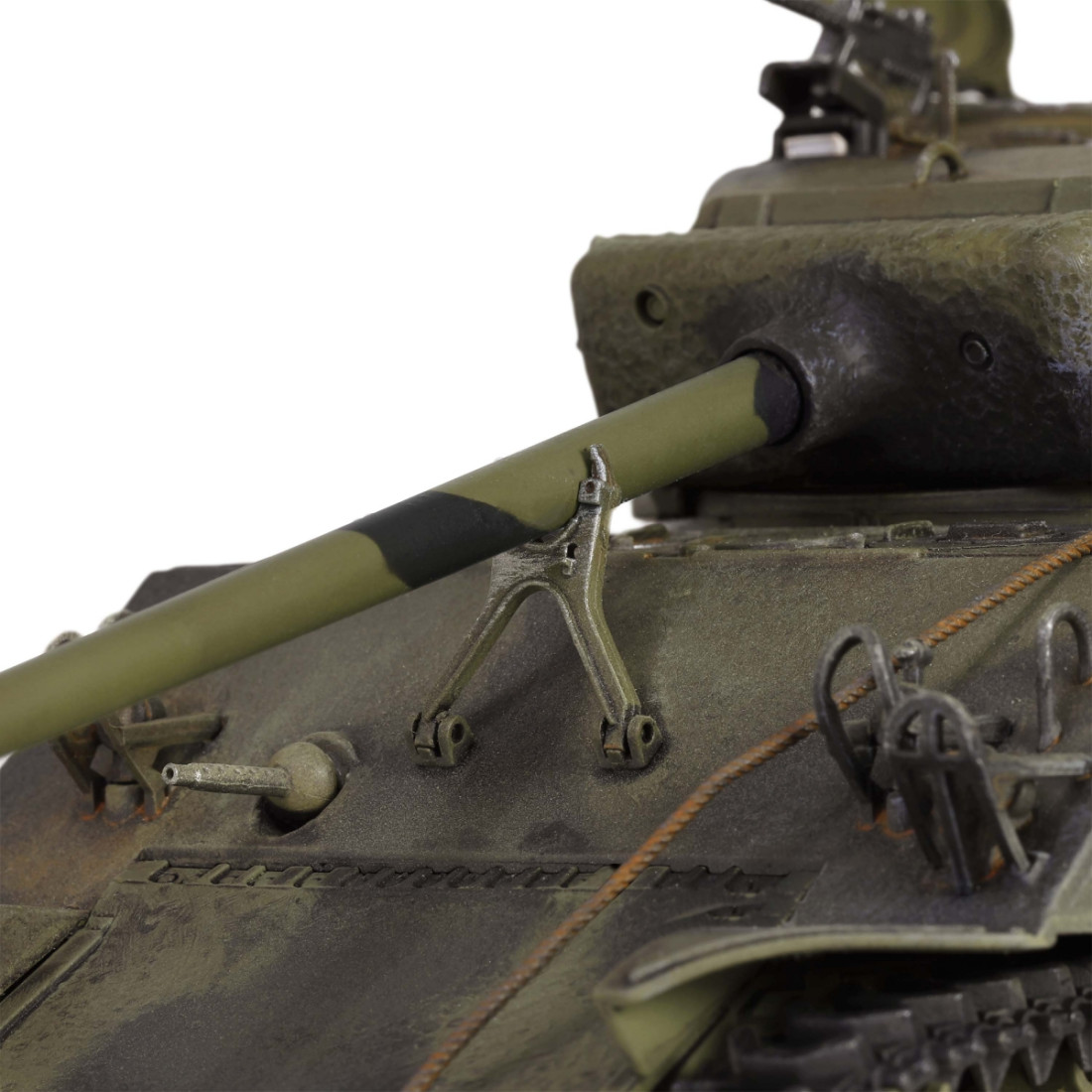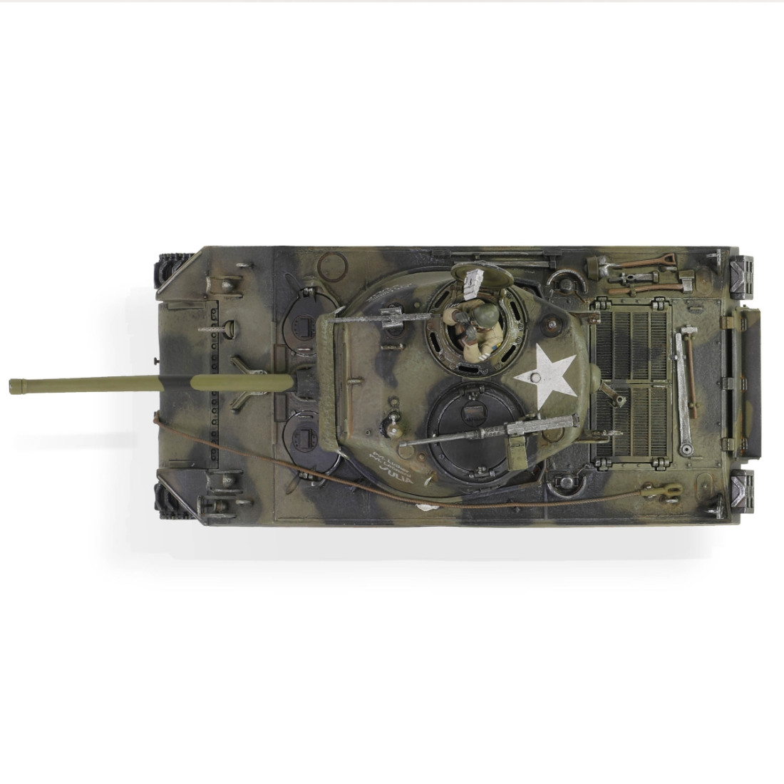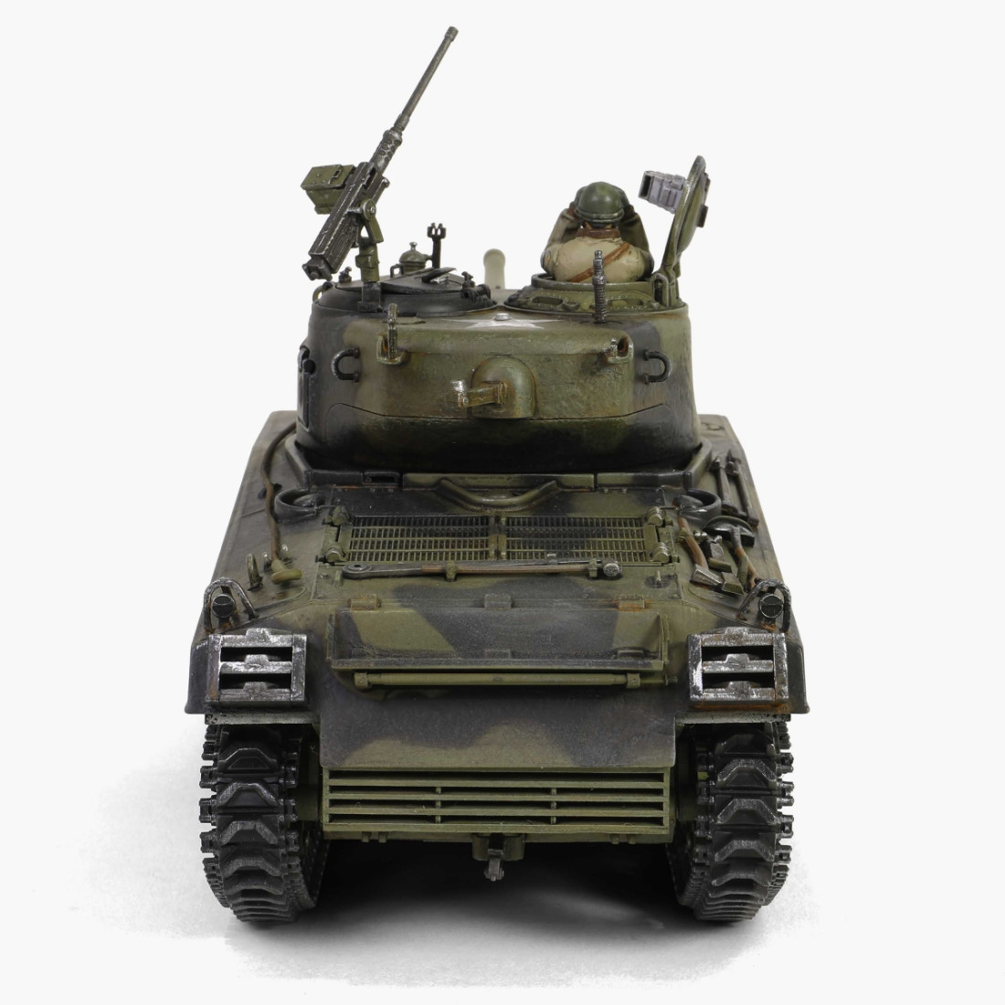 Ein sehr schön gearbeitetes Metallmodell des amerikanischen mittleren Panzers M4A3(76)W Sherman aus dem Zweiten Weltkrieg. Das Modell besticht durch zahlreiche Details, darunter ein detaillierter Motorraum und ein detailliertes Triebwerk. Es verfügt über einen drehbaren Turm, ein bewegliches Kanonenrohr und eine funktionierende Federung. Zum Lieferumfang gehören ein authentischer Sockel, Zubehör und eine realistische Panzerkommandantenfigur.