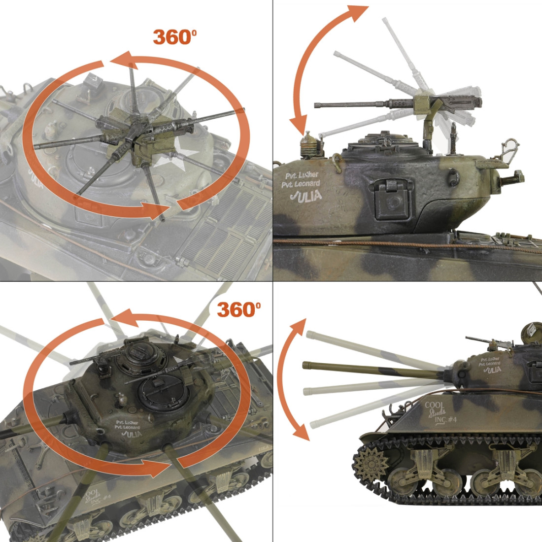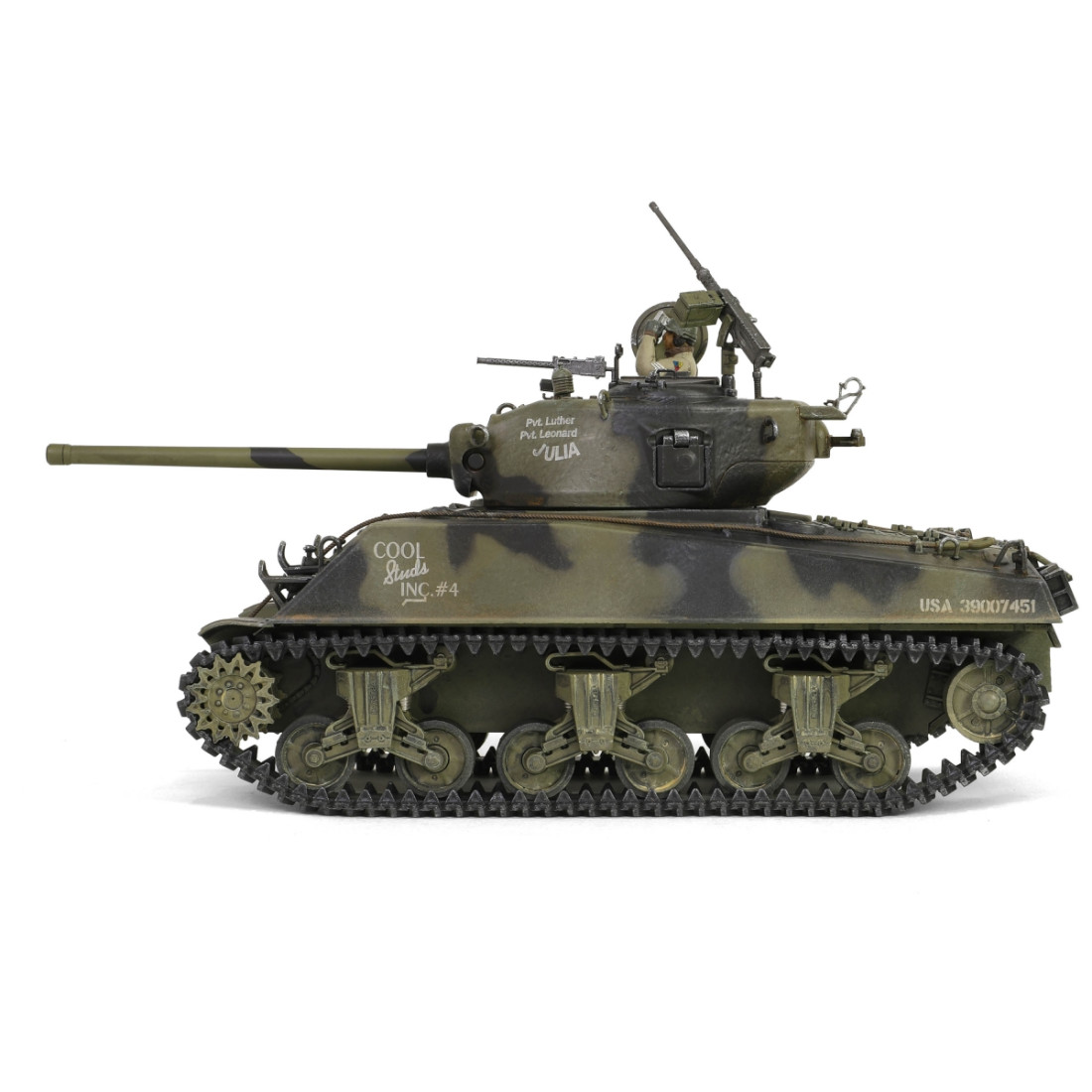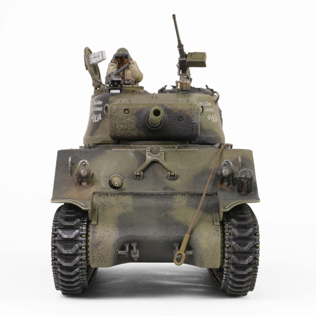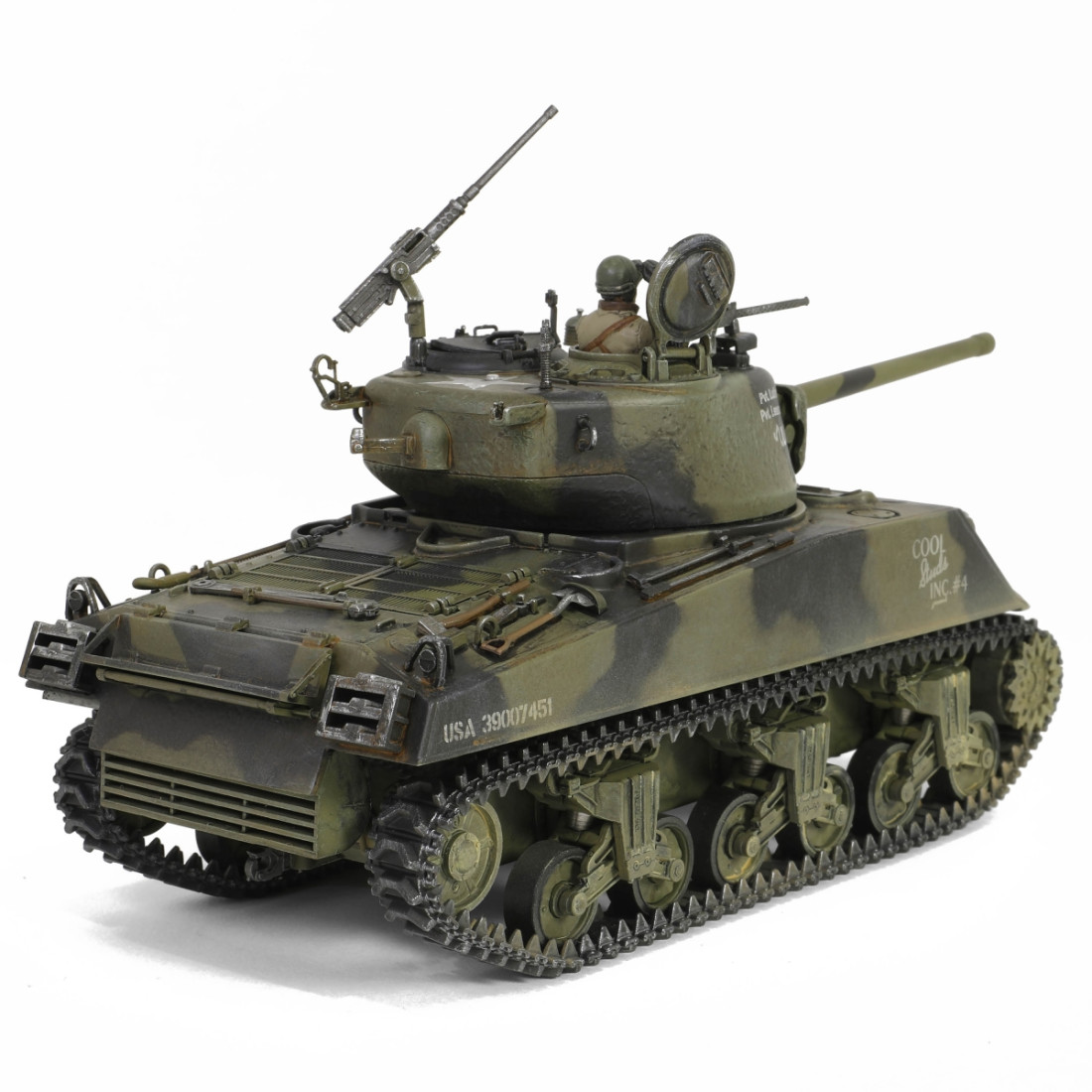 Ein sehr schön gearbeitetes Metallmodell des amerikanischen mittleren Panzers M4A3(76)W Sherman aus dem Zweiten Weltkrieg. Das Modell besticht durch zahlreiche Details, darunter ein detaillierter Motorraum und ein detailliertes Triebwerk. Es verfügt über einen drehbaren Turm, ein bewegliches Kanonenrohr und eine funktionierende Federung. Zum Lieferumfang gehören ein authentischer Sockel, Zubehör und eine realistische Panzerkommandantenfigur.