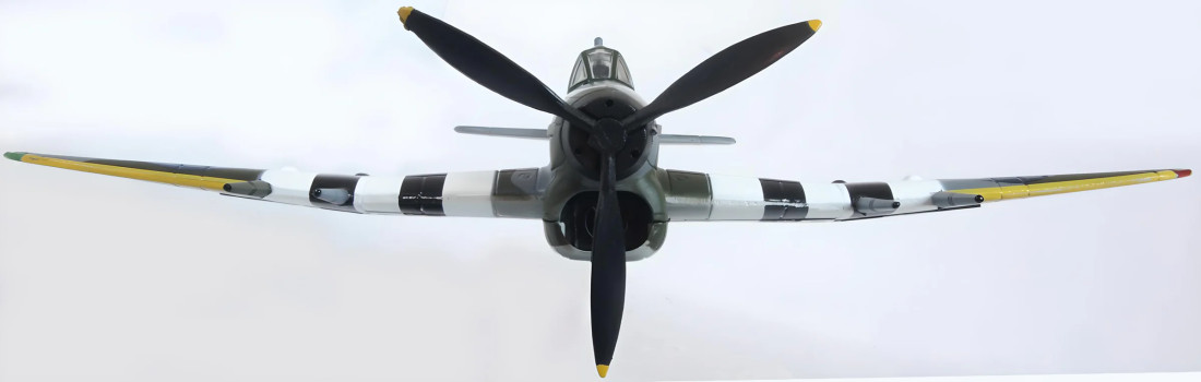 Sammlermodell aus Metall des britischen Kampfflugzeugs Hawker Typhoon Mk.I aus dem Zweiten Weltkrieg. Das Modell wird mit einem Ständer geliefert.