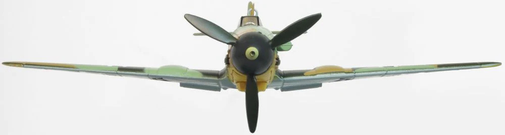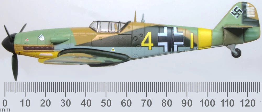 Kovový sběratelský model německého druhoválečného stíhacího letounu Messerschmitt Bf 109 F-4/Trop-104. Model je opatřen stojánkem.