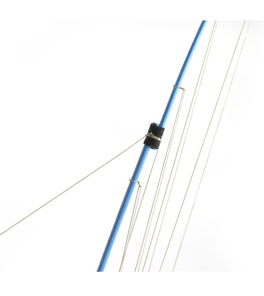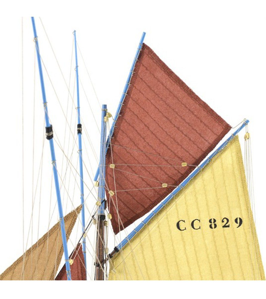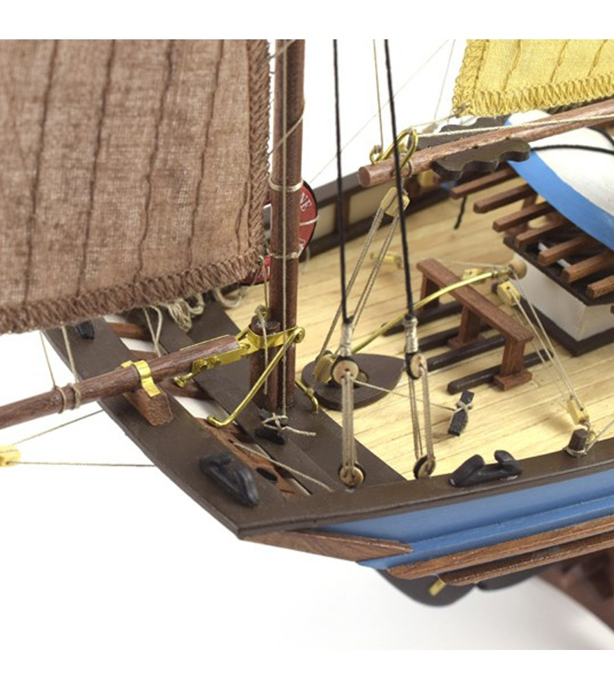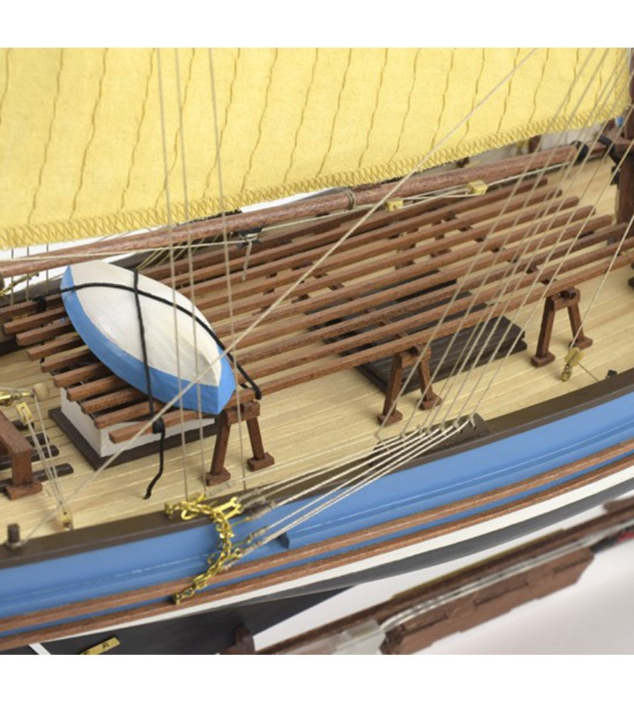 Der Bausatz enthält lasergeschnittene Sperrholzteile, Birkenholzlatten für Rumpf- und Deckbeplankung, Messing- und Gussmetallzubehör, Garn, genähte Baumwollsegel, Flagge, Aufkleber und Teile für den Bau eines Standes.