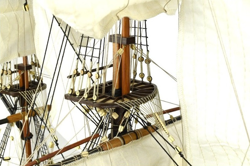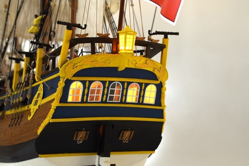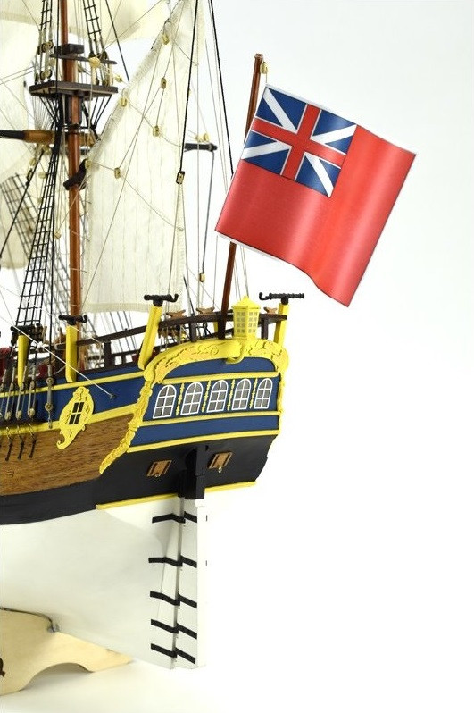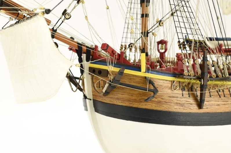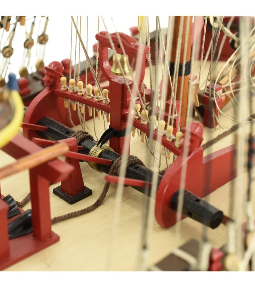 Das Modell ist mit einem falschen Kiel und Spanten konstruiert, ähnlich wie bei echten Schiffen. Der Rumpf wird in klassischer Schalenhobeltechnik, teilweise zweischichtig, gebaut. Der Bausatz enthält präzise lasergeschnittene Teile aus Holz und Sperrholz, Furnierstreifen für die Rumpfbeplankung, Messingzubehör (z. B. Kanonenrohre, Beschläge usw.), einige Metallgussteile, genähte Segel mit authentischer Textur, Fäden, Nägel und alle weiteren Baumaterialien.