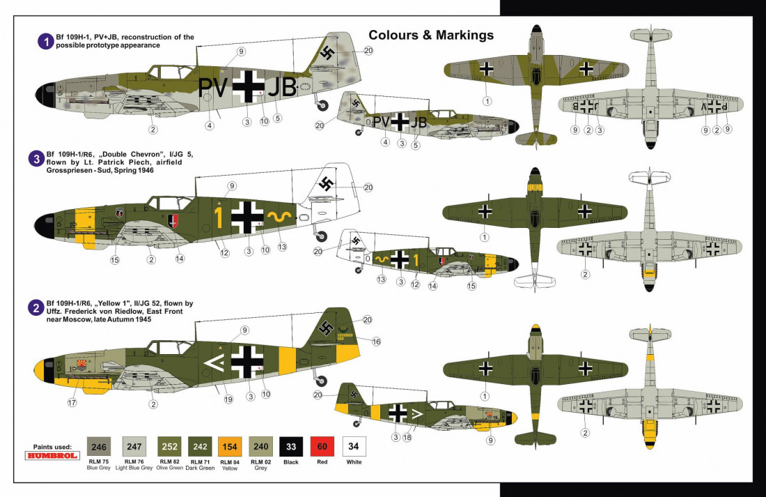 The Messerschmitt Bf 109 is one of the Luftwaffe's most famous World War II fighter aircraft. More than 33,000 Bf 109's were built in many different versions. Both its climbing capability and acceleration in the dive were two of the Bf 109s strong points. The Bf 109 H-1 was intended to be a high-altitude fighter. The wingspan was increased through the addition of new, constant-chord inner wing panels to 11.92 m. Production version, based on G-5 airframes, powered by a DB 605A engine with GM-1 boost.
