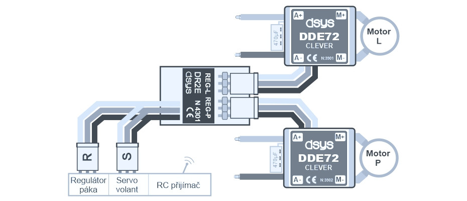 - DR2EW směšuje signály kanálu plynu regulátoru (páky) a kanálu směru (volantu, kormidla).
