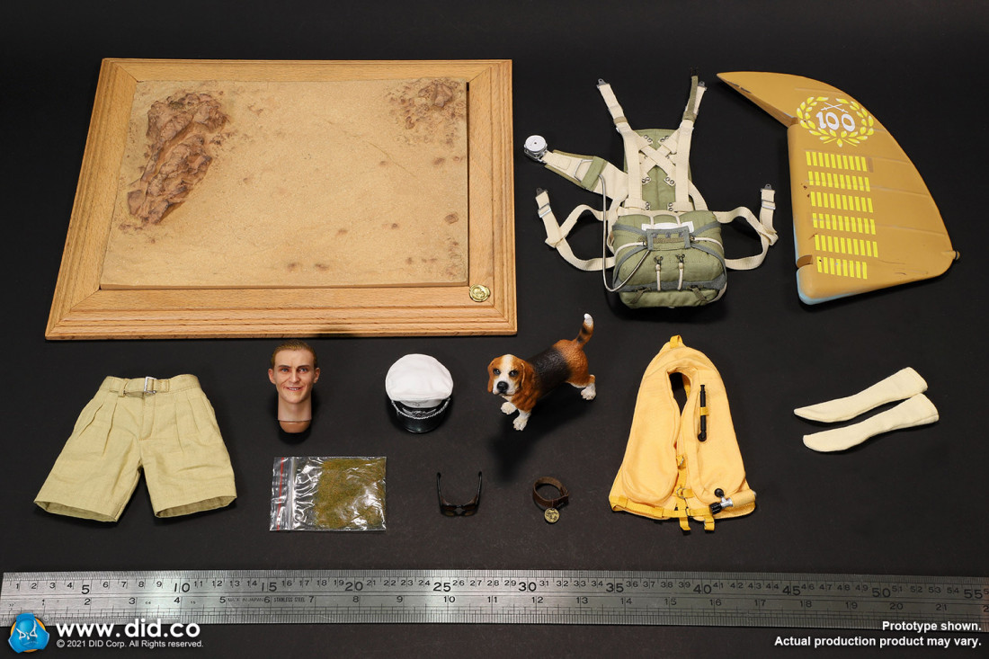 Sada příslušenství k figuře 1:6 German Luftwaffe Flying Ace “Star of Africa” – Hans-Joachim Marseille. Sada doplňků obsahuje hlavu s usměvavou tváří, padák, záchrannou vestu, bílou čepici důstojníka Luftwaffe, tropické šortky, ponožky, směrové kormidlo stíhačky Bf-109 s vyobrazenými vítězstvími a psa.