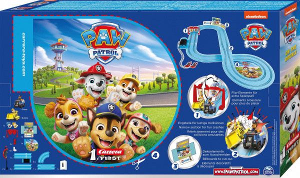 Autodráha Carrera 1. First dlouhá 2,9 m s auty Tlapková patrola Chase a Rubble. Autodráha, která je vhodná pro děti od 3 let, obsahuje rovinky, zatáčky, bránu pro větší zábavu při jízdě, ovladače a dekorace s tématikou Tlapková patrola. Autodráha se napájí prostřednictvím 4 malých monočlánků typu C.