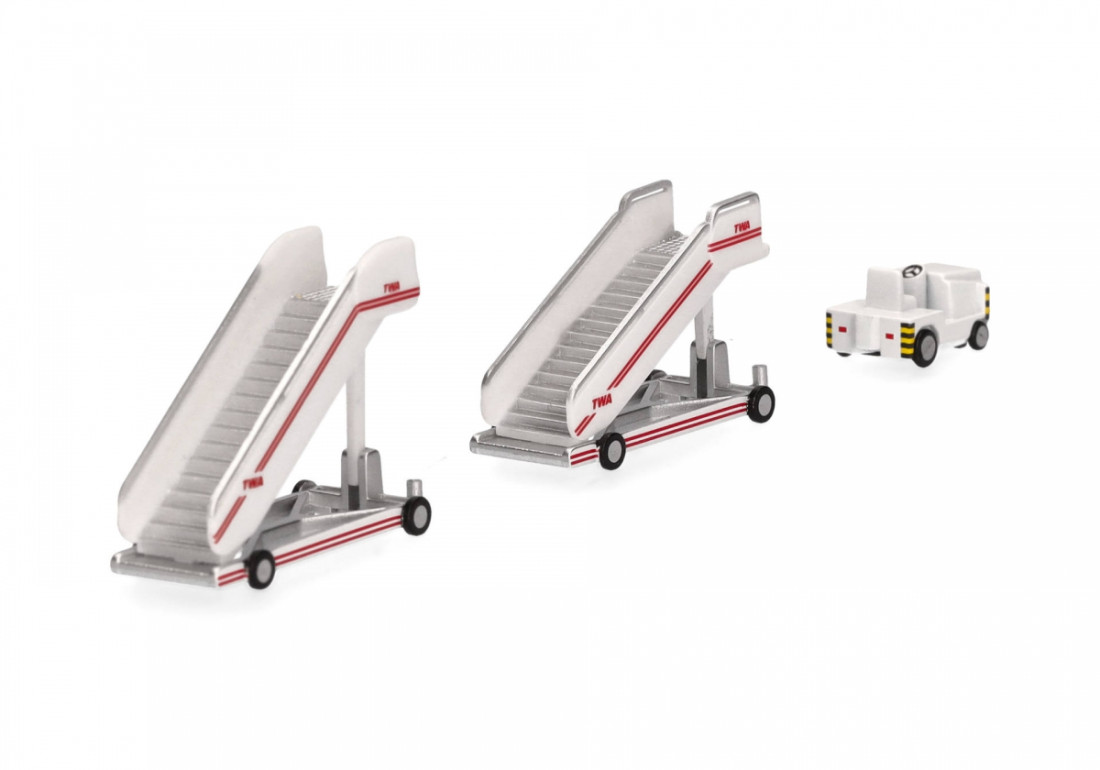 Ein historisches Set mit Flughafenzubehör der TWA im Maßstab 1:200. Das Set enthält 2 Rolltreppen und 1 Schlepper.