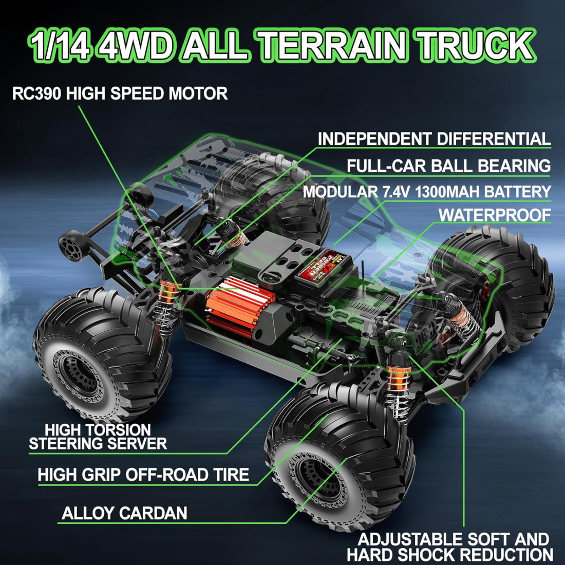 Ein komplett fertiges ferngesteuertes Monstertruck-Modell im Maßstab 1:14 mit Allradantrieb und einer Höchstgeschwindigkeit von bis zu 40 km/h. Im Lieferumfang enthalten sind ein 2,4-GHz-Pistolensender, ein modularer 7,4-V-1300-mAh-Li-Ion-Fahrakku und ein USB-Ladegerät.