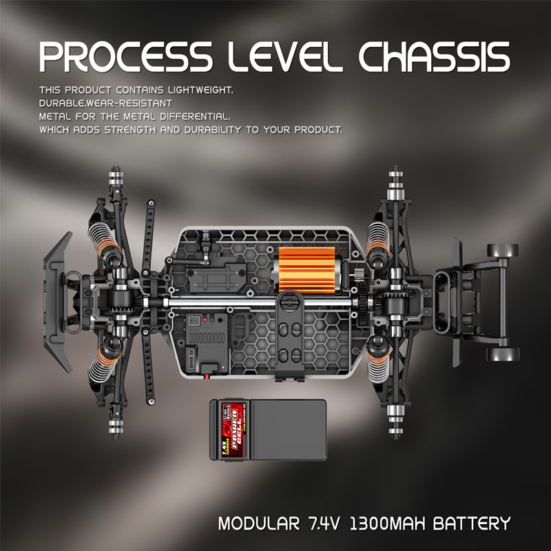 Das robuste Chassis mit Wabenbodenverstärkung ist kugelgelagert, und selbstverständlich sind eine Einzelradaufhängung mit CVD-Achsen, Planetendifferenziale mit Metallgetriebe vorn und hinten, nahezu wartungsfreie Reibungsdämpfer, eine Metall-Mittelantriebswelle und eine vollproportionale Lenkung vorhanden. Die elektronisch abregelbare Höchstgeschwindigkeit des Modells beträgt 40 km/h.