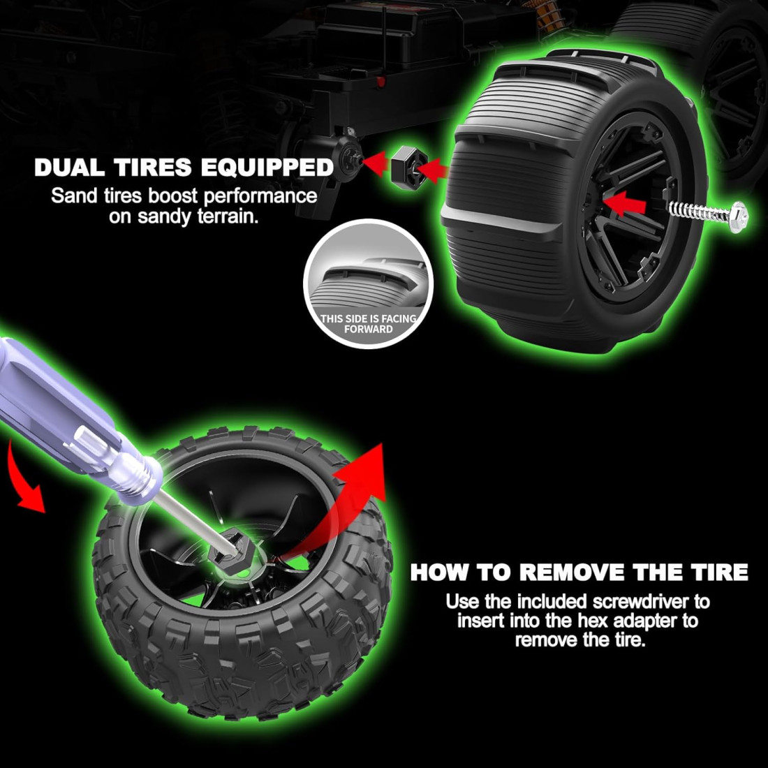 Der gut gestaltete, ergonomische Sender ist mit einer integrierten Antenne, einer Lenkungsverkleidung und einem Controller ausgestattet, mit dem Sie die Höchstgeschwindigkeit des Fahrzeugs elektronisch begrenzen können. Der Sender wird mit drei AA-Batterien betrieben (nicht im Lieferumfang enthalten). Das Auto bietet sehr gute Fahreigenschaften und solide Geländegängigkeit.